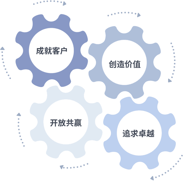 成就客户是一切决策的出发点,,,创造价值是衡量所有工作的标准,,,,追求卓越是我们做事做人的态度,,开放共赢是我们的格局也是最终的结果。。价值观的齿轮环环相扣,,,推动着组织里的每个人不断向前。。。